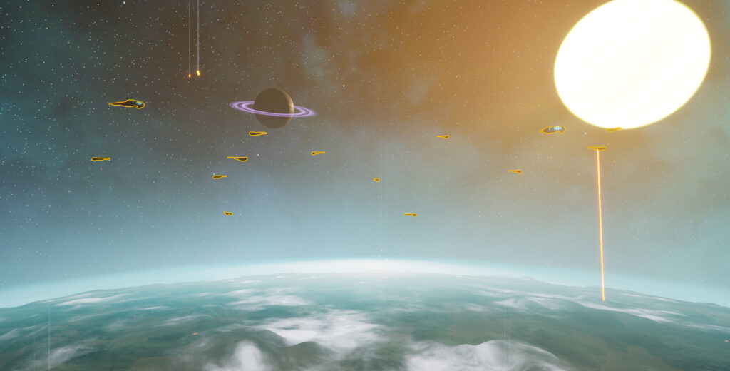 For all the spaceships, we used a Niagara system responsible for placing and spawning the ships. Each ship then spawns additional emitters to handle its attack behavior.